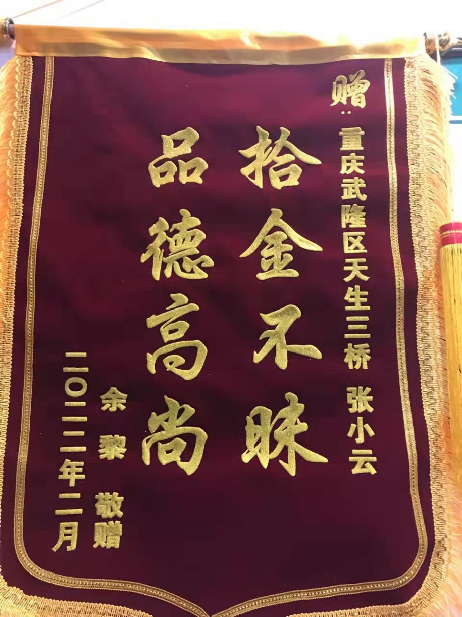 近日,武隆天生三橋景區員工張小云收到重慶游客余先生寄來的包裹,包裹里是一面繡有“拾金不昧 品德高尚”的錦旗,以此對張小云拾金不昧的行為表示誠摯的感謝。
