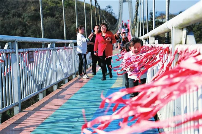 △白馬山天尺情緣景區(qū),游客穿越同心橋。(代君君/攝)