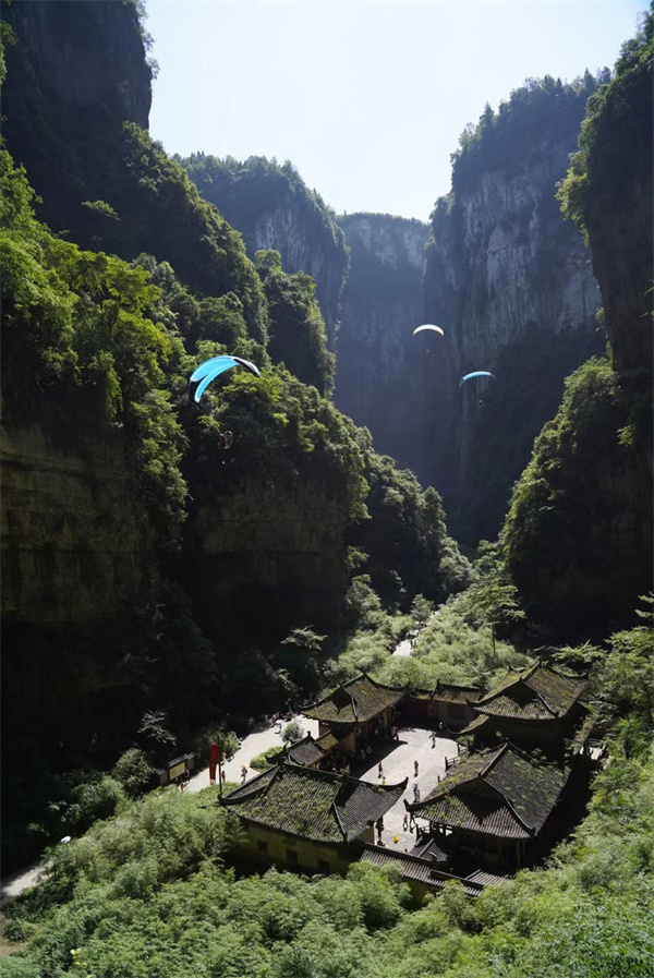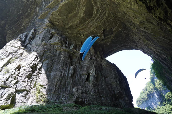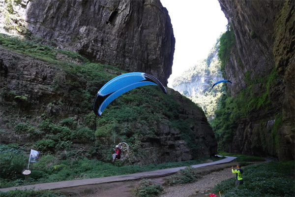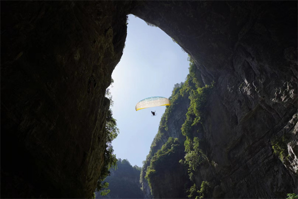 據悉,這是世界首次動力傘成功穿越天生三橋,而實際上,作為世界規模最大天生橋群,其鬼斧神工的險峻自然奇觀已經成為各類極限運動挑戰的熱門打卡地。挑戰成功后,7月28日至30日每天上午9:30、11:30、下午15:30,盛廣強及其團隊還將在天生三橋進行為期三天的表演活動。