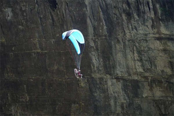 不同以往在空曠的區域進行飛行降落,此次盛廣強挑戰難度升級,不僅需要安全著陸,還要完成了高難度動作,從天生三橋谷底起飛,穿越三座寬度不足30米、形狀不規則的天然石拱橋。“由于石拱橋兩端的大峽谷氣流方向不一致,導致狹長的石拱橋空間內氣流混亂,進一步提高了挑戰難度。”工作人員表示。