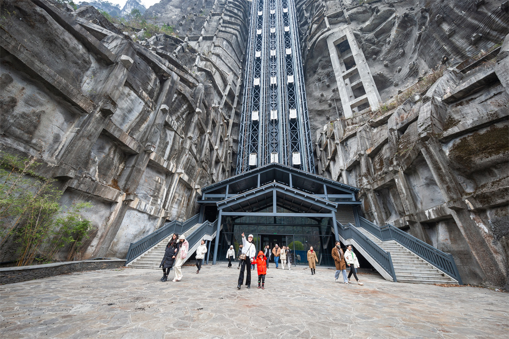 新電梯的建成,既減少了游客進(jìn)入景區(qū)的排隊(duì)時間,也增加了約2300米旅游線路,游客乘坐電梯需通過鑲嵌在幾百米懸崖上的步行棧道,穿過崖壁隧洞。在建成投用的第一天,不少游客紛紛前往打卡,欣賞這一自然美景與人造景觀完美結(jié)合的神奇之作。