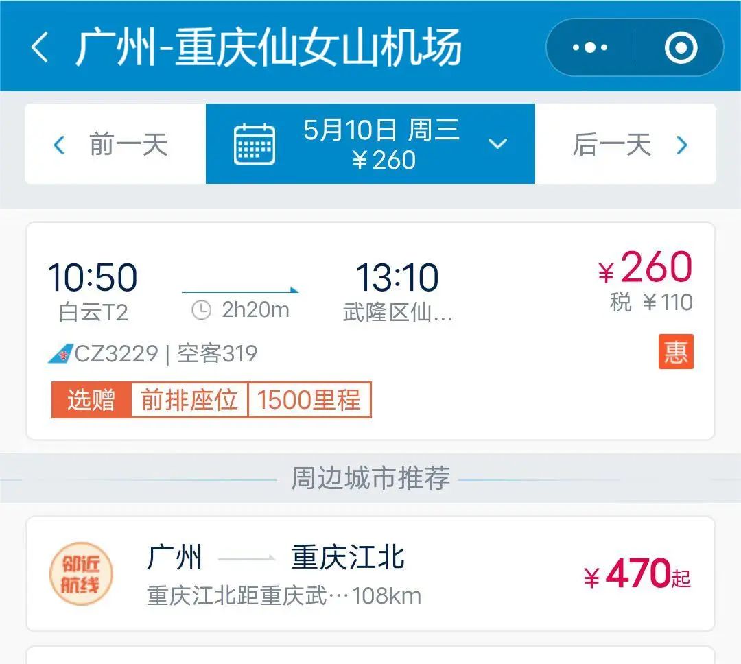 航班:CZ3229,10:50廣州起飛,13:10到達(dá)武隆