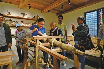 在后坪木器非遺工坊,只見非遺傳承人在“車床”上用各種刀具進行切、削、刻等操作,木料飛速旋轉,光滑美觀的木器初見雛形,吸引了外國嘉賓駐足觀看。他們躍躍欲試,在非遺傳承人的指導下,紛紛體驗了木器的制作過程。來自菲律賓的盧蒙索德加貝斯現場拜師學藝,過了一把“木匠”癮后表示:“這里的非遺文化不僅有特色,也保存得非常好,我非常喜歡。”