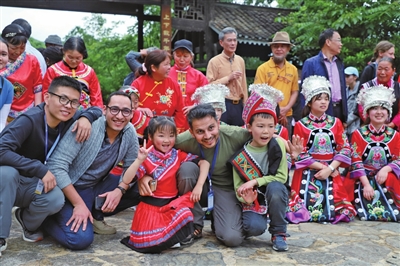 “大河漲水小河滿,文鳳兒女盡歡顏,留住青山是金山,鳳凰飛在彩云間。”汽車剛駛入天池苗寨,一陣嘹亮、歡快的山歌聲從寨中飄來。在苗寨門口,外國嘉賓們一下車,身著苗族服飾的苗家阿哥阿妹便載歌載舞、端上米酒熱情地迎接嘉賓們。嘉賓們接過米酒,一飲而盡,便與阿哥阿妹一起走進苗寨。