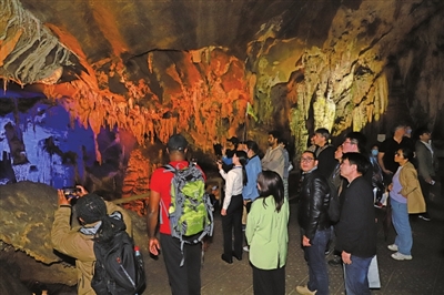 石鐘乳、石葡萄、石膏花、石珊瑚……芙蓉洞是武隆三大喀斯特系統之一,以豎井眾多、洞穴沉積物類型齊全、形態完美、質地純凈著稱,被地質學家評價為“一座斑斕輝煌的地下藝術宮殿,一座內容豐實的洞穴科學博物館”。外國嘉賓們一走進芙蓉洞中,就被形態多樣的沉積物深深吸引,他們仔細觀看洞內各類巖溶沉積物,既驚嘆大自然的神奇,又為有幸目睹這樣神奇的洞穴景觀而眉飛色舞。來自美國西肯塔基大學的教授克里斯·葛立夫說,芙蓉洞高度達到上百米,沉積物種類十分豐富且保存得很好,給他留下很深的印象。他表示,將推動美國猛犸洞與中國芙蓉洞兩個姊妹洞穴在科考研究、資源保護方面深入合作。