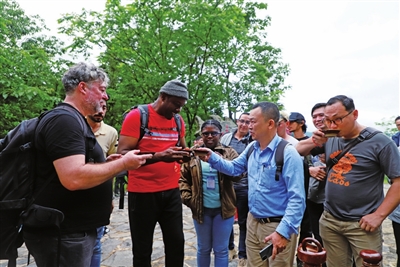 在天生三橋,外國嘉賓冒著蒙蒙細雨,一路欣賞獨特的喀斯特地貌,一邊交流巖溶研究專業問題。在后坪天坑群旁邊,前來考察的外國嘉賓通過無人機等設備,對天坑一探全貌。