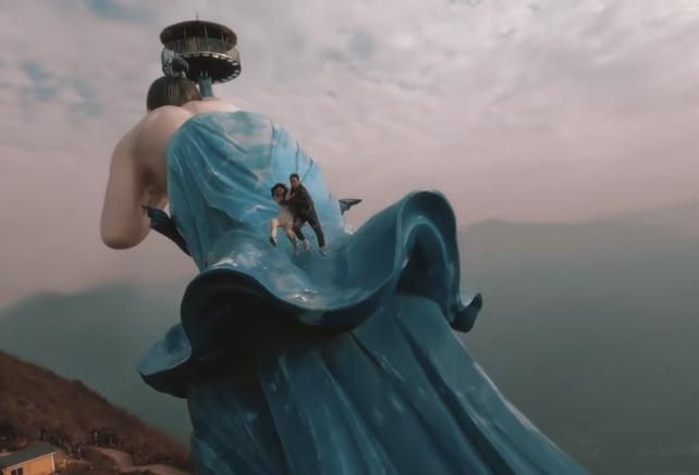 飛天之吻位于白馬山天尺情緣景區,高達55米,建立在千米高的懸崖邊上,是全球唯一的雙子互動飛行島,南邊代表的是太子,而北面代表的是仙女。一男一女兩座島嶼,從地面上慢慢升到天空當中,在高空旋轉完成高空一吻,異常刺激是重慶最熱門的網紅打卡地之一。