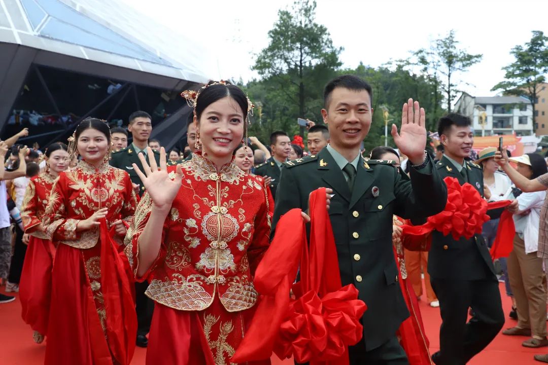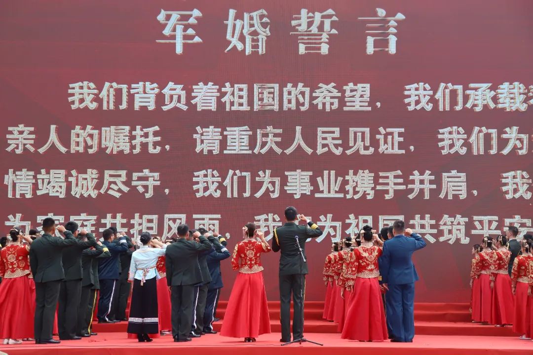 8月8日上午,第二屆西部邊防暨駐渝部隊(duì)官兵集體婚禮在白馬山天尺情緣景區(qū)舉行,100對新人在眾人的祝福下喜結(jié)連理,宣讀軍婚誓言,共同步入神圣的婚姻殿堂。