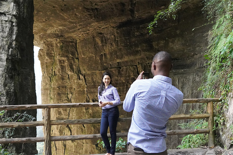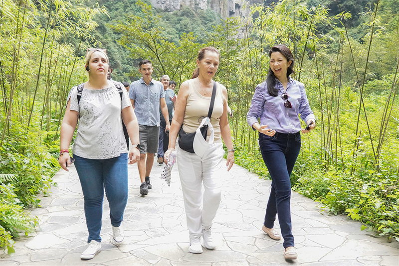 9月7日,初秋時節的世界自然遺產地--天生三橋景區風景如畫,氣勢磅礴的天生石橋和綠意盎然的山林相映成趣,吸引眾多游客前來觀光。拉丁美洲駐華大使代表團一行和眾多游客一起沿著蜿蜒的石板小路前行,雄、奇、險、峻、秀的喀斯特自然美景,也折服了遠道而來的外賓。