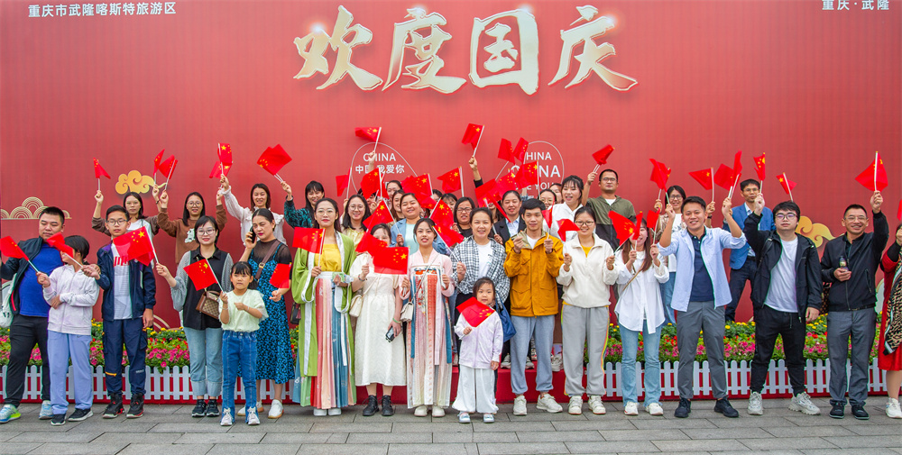 如果信仰有顏色,那一定是中國紅。國慶期間,武隆各大景區(qū)都穿上了“中國紅”新裝。在仙女山游客接待中心,景區(qū)設(shè)置了巨型“歡度國慶”紀(jì)念展板,吸引不少游客拍照打卡。每個人都揮舞手中的小紅旗,給現(xiàn)場染上熱烈的紅色。