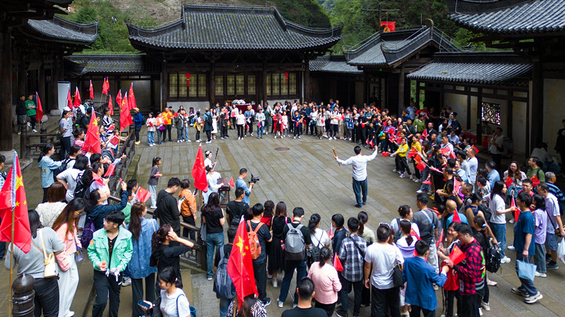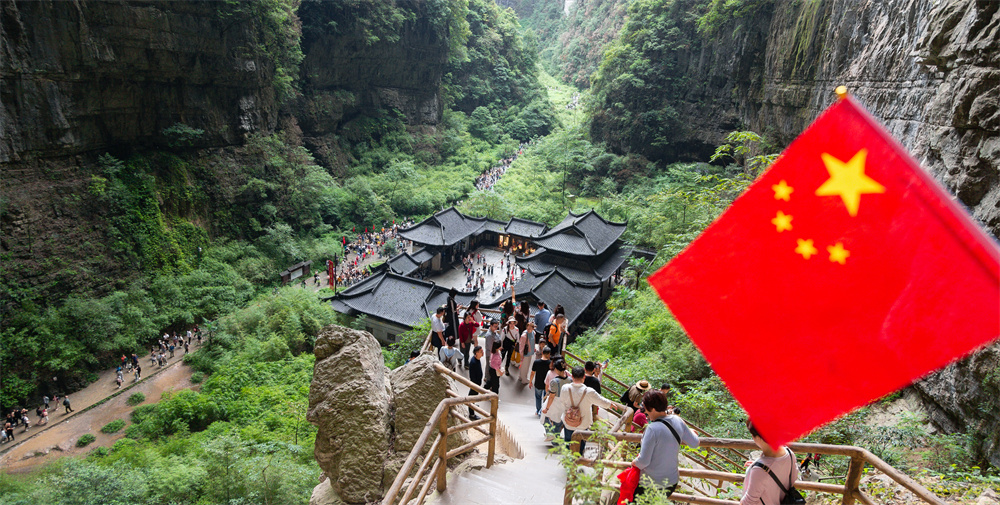 “我和我的祖國,一刻也不能分割,無論我走到哪里,都唱出一首贊歌”。在武隆天生三橋景區(qū)天福驛站內(nèi),一首《我和我的祖國》響徹整個天坑。這是景區(qū)開展的《我和我的祖國》快閃活動,聽到熟悉的旋律,游客紛紛聚攏過來,揮舞著手中的國旗,一齊唱響對祖國母親的祝福,場面壯觀喜慶、氛圍熱烈。