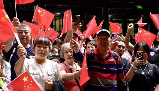 國旗映紅了一張張笑臉,那是對祖國巨大成就自豪的笑臉,是對祖國壯麗山河熱愛的笑臉。路過的游客紛紛駐足,以紅色展板為背景,和家人拍個合影或者帶著孩子錄個小視頻,以此表達(dá)游客的愛國之心。