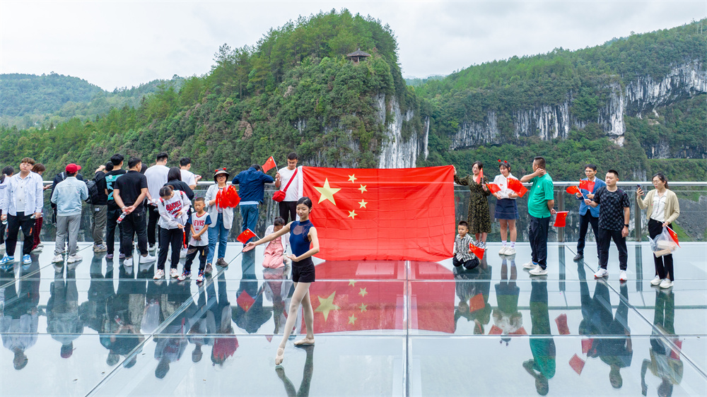 下午2點,在300米垂直懸崖絕壁之上,一面火紅的國旗尤其絢麗吸睛,多名游客登上武隆天生三橋懸崖玻璃眺臺,在300米高空和國旗合影,以此來表達(dá)對祖國母親的祝福。