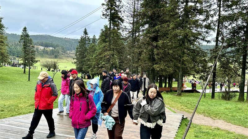 下午,旅行團不顧旅途奔波,又馬不停蹄來到了譽為“南國第一牧原”、“東方瑞士”“綠色氧吧”的仙女山國家森林公園,剛走進景區,遠道而來的游客們就被山間綠樹蔥蘢,郁郁蒼蒼的景色所吸引,連連稱贊。“空氣特別新鮮,武隆很棒!“來自河南的王阿姨表示。