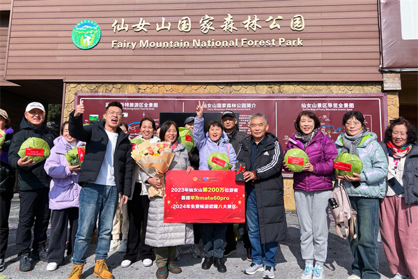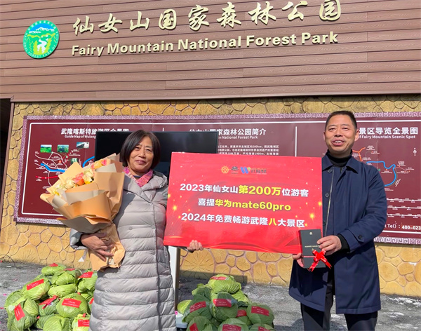 上午11時54分,來自山東濟南的幸運游客潘榮華成為仙女山旅游景區第200萬名游客,并獲得景區贈送的“遙遙領先”豪華大禮,其中包括華為mate60pro手機、2024年全年免費暢游武隆八大景區。