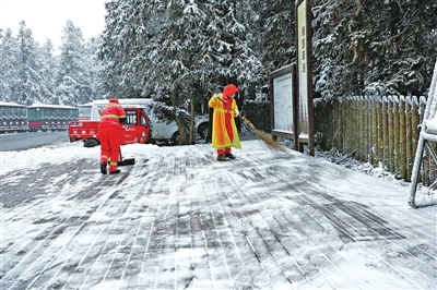 在平均海拔1900米的仙女山景區,大雪紛紛揚揚,覆蓋了整個道路和森林。景區出動掃雪車9臺、屯工業鹽200噸左右、皮卡車3臺、撒鹽器2臺、運鹽貨車1臺,除冰除雪人員23人對主干道進行融雪除冰。