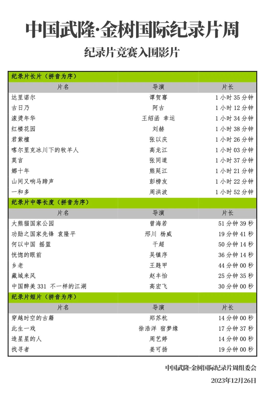 中國武隆·金樹國際紀(jì)錄片周自2023年10月1日開始征片,得到了國內(nèi)紀(jì)錄片行業(yè)的廣泛關(guān)注和支持,12月10日截止報(bào)名,累計(jì)征集了3143部作品。經(jīng)過33位初評(píng)委和5位預(yù)評(píng)委的辛苦工作和認(rèn)真評(píng)審,最終有21部影片入圍,角逐7個(gè)獎(jiǎng)項(xiàng)。終評(píng)委團(tuán)隊(duì)由來自六個(gè)國家的7位紀(jì)錄片專家組成。