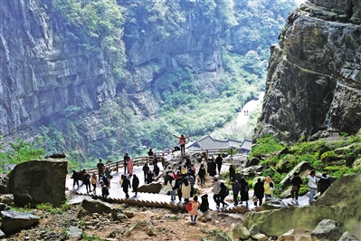 在天生三橋景區,游客朋友文明排隊,有序入園。蜿蜒的步游道上一步一景,雄奇險峻的喀斯特自然美景吸引了游客朋友紛紛掏出手機拍照留影,大家紛紛驚嘆大自然的鬼斧神工。