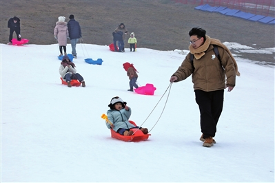 當天,在仙女山室外滑雪場,尖叫聲、歡呼聲此起彼伏。小朋友們坐在五彩繽紛的滑雪車上,沿著雪坡順勢而下;滑雪愛好者則在教練的帶領下練習雪板滑雪的基本動作。大家歡笑著、打鬧著,盡情享受著雪上運動的快樂。