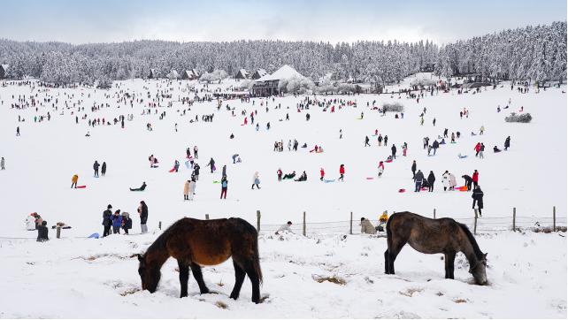 茫茫草原林海秒變仙境,白雪覆蓋的房屋變成城堡!被雪花加持的仙女山每天都迎來大批游客涌入打卡,玩雪戲雪、堆雪人、打雪仗、拍照留影,景區到處到處呈出人聲鼎沸、熱鬧非凡場面。憑借超高人氣,仙女山國家森林公園多次登上微博重慶地區“人氣地標榜”,位列榜首。