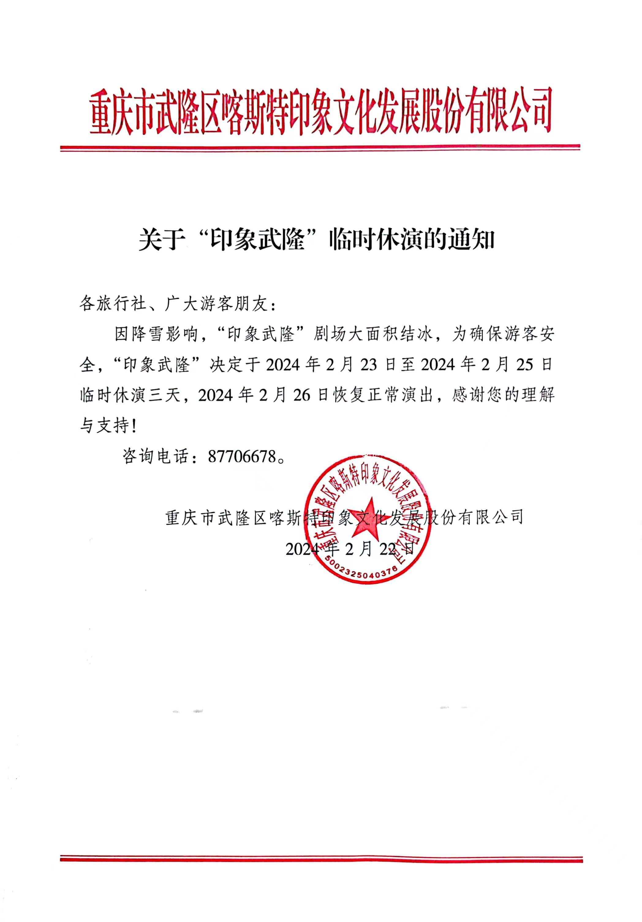 因降雪影響,《印象武隆》劇場大面積結冰,為保證游客觀演安全,《印象武隆》將于2月23日——2月25日臨時休演三天,2月26日恢復正常演出。