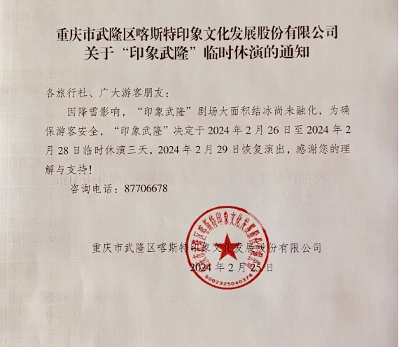 因降雪影響,《印象武隆》劇場大面積結冰尚未融化,為保證游客觀演安全,《印象武隆》將于2月26日——2月28日臨時休演三天,2月29日恢復正常演出。