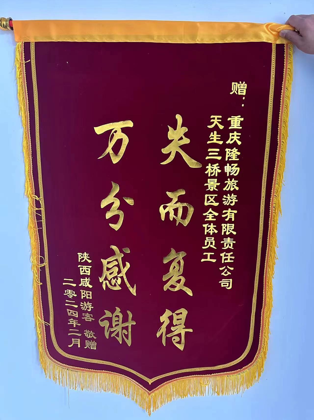 今年以來,武隆景區多次發生類似員工拾金不昧,被游客稱贊的情況。近日,武隆天生三橋景區收到陜西籍游客王女士寄來的包裹,包裹里是一面繡有“失而復得、萬分感謝”的錦旗,以此對天生三橋景區全體員工拾金不昧的行為表示誠摯地感謝。