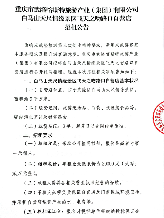 重慶市武隆喀斯特旅游產業(集團)有限公司白馬山天尺情緣景區飛天之吻路口自營店招租公告