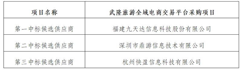 按照重慶武隆旅游產(chǎn)業(yè)(集團)有限公司關(guān)于《武隆旅游全域電商交易平臺采購公告》相關(guān)要求,比選工作嚴格按照比選流程及評審方法進行,現(xiàn)將中標候選供應(yīng)商公示如下:
