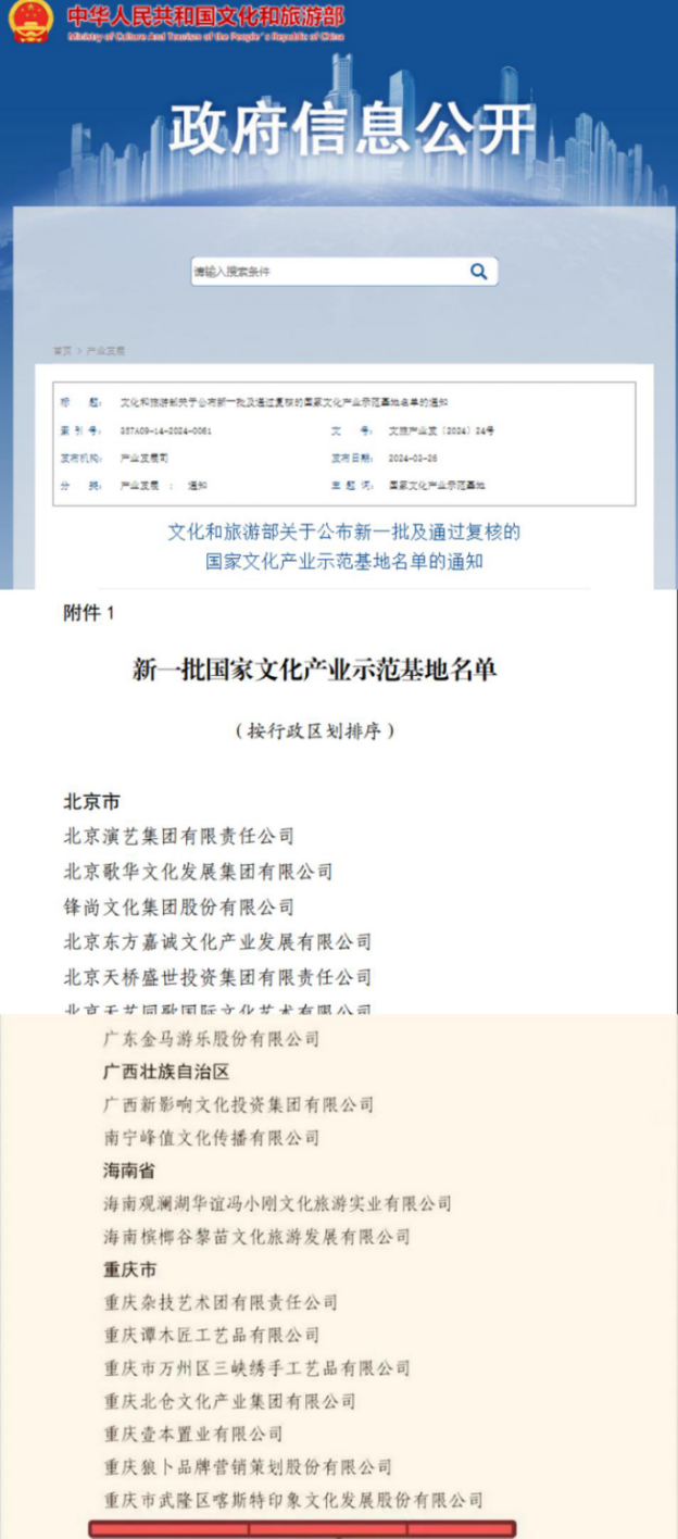 喜訊!2024年3月26日,文化和旅游部公布命名全國219家企業為新一批“國家文化產業示范基地”,其中,印象武隆(重慶市武隆區喀斯特印象文化發展股份有限公司)成功入選。這一榮譽稱號,標志著武隆區在國家文化產業發展方面取得了重大突破,同時也為武隆旅游產業注入了新的活力。