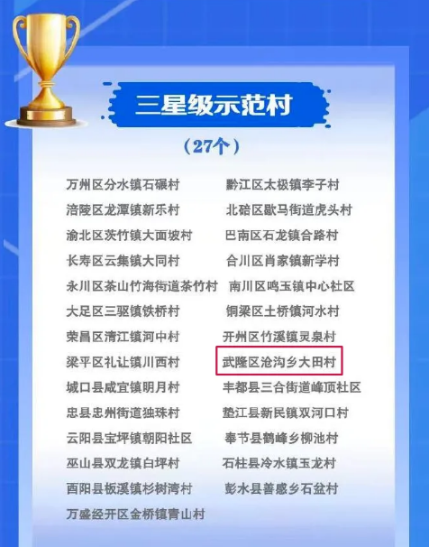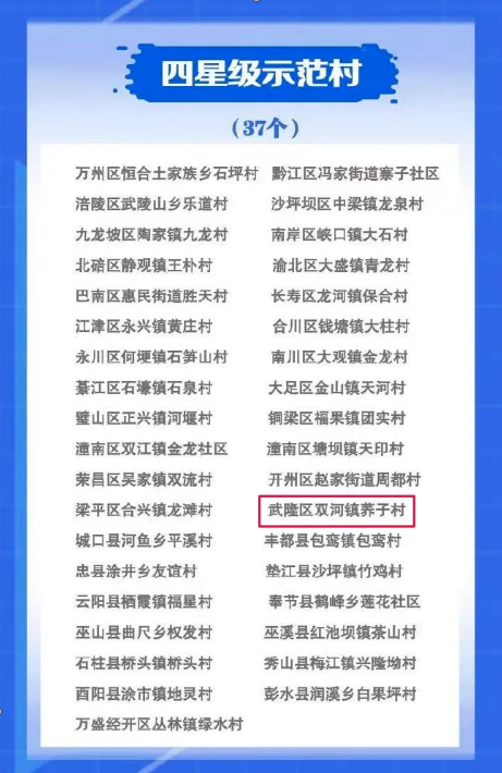 近日,重慶市農業農村委(重慶市鄉村振興局)公布2023年度巴渝和美鄉村示范村創建結果,107個村(涉農社區)成功創建巴渝和美鄉村示范村,包含五星級示范村43個、四星級示范村37個、三星級示范村27個。其中,仙女山街道荊竹村獲評五星級示范村,雙河鎮蕎子村獲評四星級示范村,滄溝鄉大田村獲評三星級示范村。