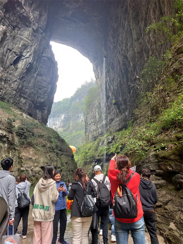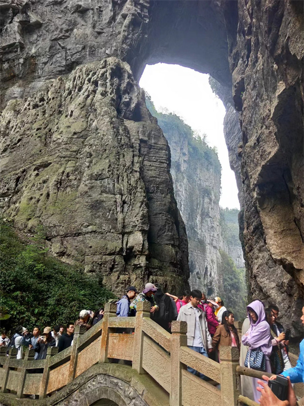 大自然的恩賜,讓“天生麗質”的武隆,成為展示喀斯特地貌與自然景觀的最好范例。特別是鬼斧神工的天生三橋。下午,前往天生三橋的游客絡繹不絕,景區檢票口以及換乘車處都排起了長龍。雖然游客有所增加,但多而不亂,旅游秩序井然有序。
