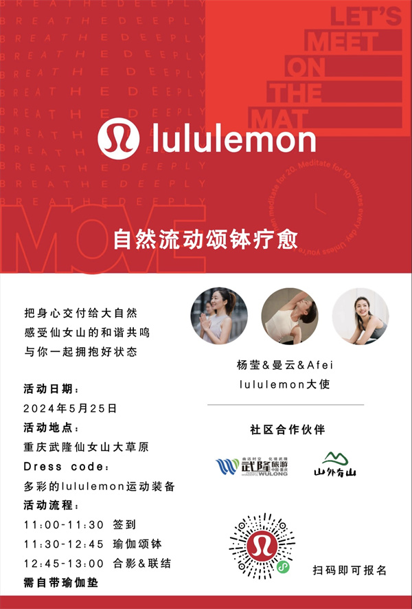 本次活動不僅有看點,而且有耍事、有體驗。5月25日,仙女山景區將聯合lululemon在大草原設置5個與自然景觀融為一體的運動挑戰點,飛盤打靶、戰繩挑戰、健球互傳、spikeball(mini排球)、戶外筋膜刀放松體驗,屆時還將有重慶頂流運動大使現身上課、互動。