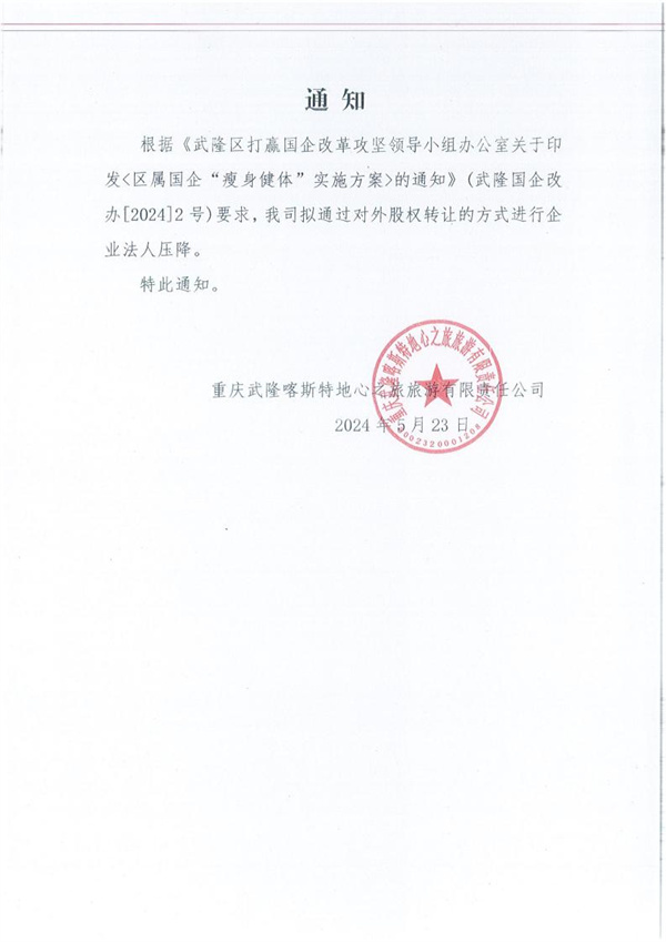 關于重慶武隆喀斯特地心之旅旅游有限責任公司股權轉讓的通知