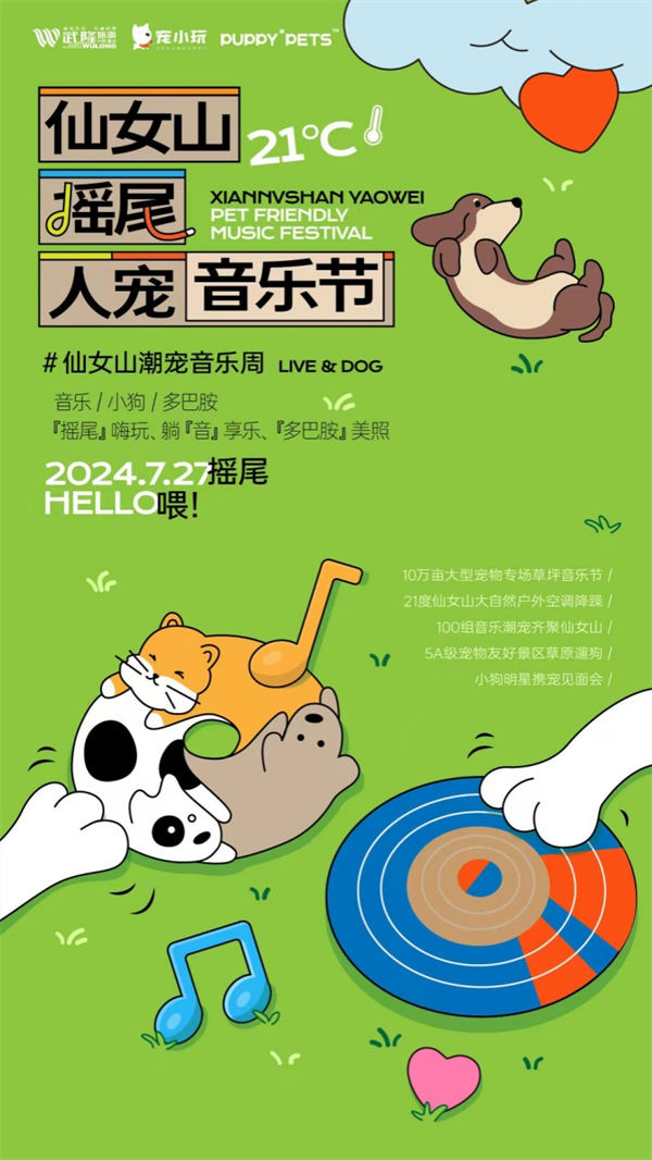 在8.17仙女山明星音樂節(jié)正式到來之前,這周末(7月27日),武隆景區(qū)誠邀所有“鏟屎官”,一起到仙女山體驗“仙女山「搖尾」人寵音樂節(jié)”的獨特魅力。這是一場以萌寵、音樂、多巴胺、躺平為主題打造的寵物友好大型戶外草坪音樂節(jié),將帶您感受一次松弛、治愈、快樂的寵物音樂盛宴!