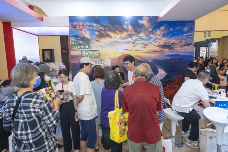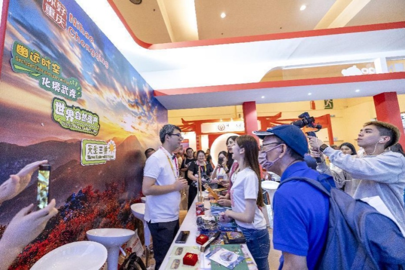 走進展會,中央大屏滾動播放的重慶文旅宣傳片源源不斷地將各國展商和觀眾引向中國展區,重慶展臺全方位展示以長江三峽、世界自然遺產、世界文化遺產、8D魔幻都市為代表的重慶文旅資源,成為展區“最靚的仔”。