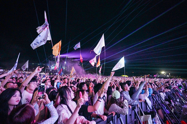 下午1點,隨著激昂的旋律響起,痛仰樂隊率先登場,他們以獨特的音樂風格和激情四溢的表演,迅速點燃了現(xiàn)場的氣氛。《再見杰克》《公路之歌》《西湖》等歌曲一出來,歌迷們熱情高漲,開始花式搖滾狂歡,開火車、揮手蹦迪、搖頭狂歡……人群與派對、尖叫與吶喊,歡呼聲一浪接著一浪。