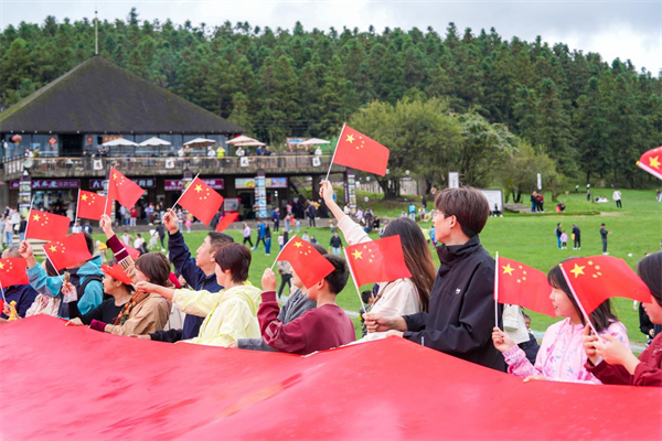 此外,仙女山景區(qū)、天生三橋景區(qū)巨幅國旗的傳遞活動(dòng)更是將現(xiàn)場(chǎng)氣氛推向了高潮。游客們手持國旗,深情獻(xiàn)唱《我和我的祖國》,用歌聲表達(dá)對(duì)祖國的熱愛與祝福。