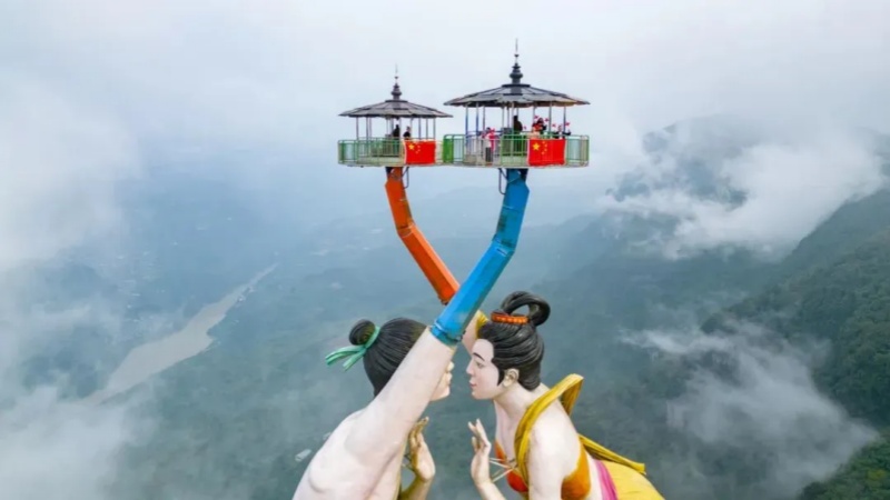 景區地址:重慶武隆白馬山天尺情緣景區景區簡介:白馬山天尺情緣景區海拔1200米,空氣清新,是避暑納涼、休閑度假的必選之地。有火爆全網的“飛天之吻”,它建于望仙崖的懸崖邊上,升起后底座距崖底烏江的垂直落差達1314米,站在由仙女、王子托舉著的小亭里,可以鳥瞰整個景區的美麗風光,在其升到最高處時,還會出現“深情一吻”。
