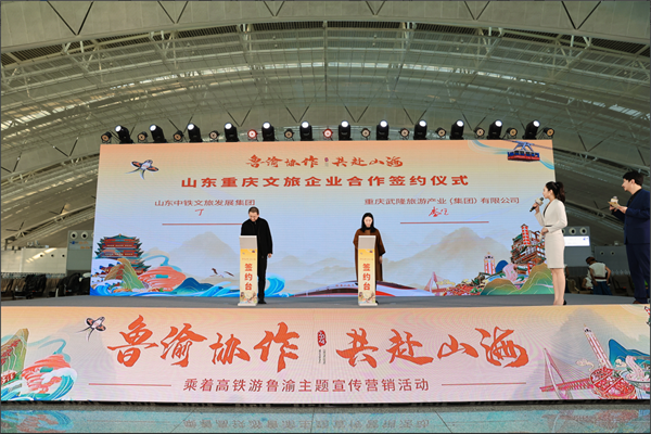 儀式上,重慶武隆旅游產業(集團)有限公司營銷總監 李安藝與山東中鐵國際旅行社有限公司黨支部書記、執行董事王斌進行現場簽約。隨著旅游專列的開行,兩家文旅企業將在站車文旅項目推廣、兩地游客互送等方面深入合作,共謀文旅新發展。今后,武隆景區將為來自山東的游客量身打造更多精品旅游線路,提供更為豐富的旅游產品及優質的旅游服務。