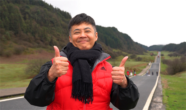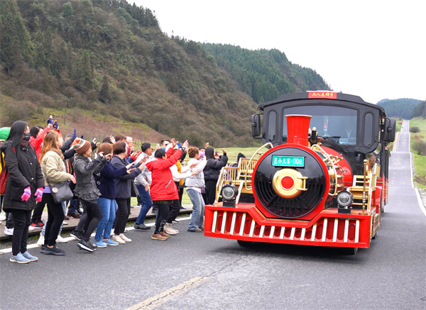 來到仙女山景區(qū),旅游團(tuán)穿過林間小道,一片遼闊的高山草原映入眼簾,讓人頓覺心情舒暢;在草原上漫步、與小羊親切互動,無比愜意。令人驚喜的是,梁導(dǎo)帶領(lǐng)旅游團(tuán)在仙女山最美公路,與《我在武隆》團(tuán)隊夢幻聯(lián)動,跳起了近期火爆全網(wǎng)的《APT.》舞蹈。音樂無國界,在場的每位游客都沉浸在歡快的旋律中,盡情地舞蹈;當(dāng)火紅的小火車駛過,游客們紛紛招手,與它打招呼或道別。