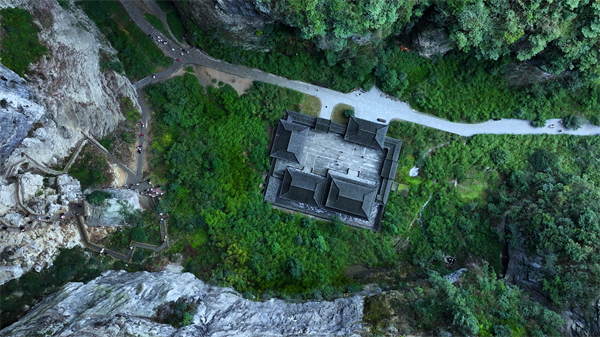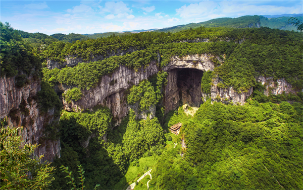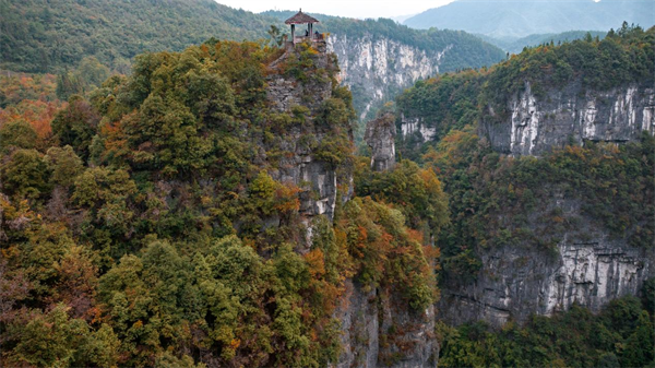繼續(xù)深入,你會(huì)發(fā)現(xiàn)天生“四橋”的奧秘遠(yuǎn)不止于此。登上那座凌駕于秘境之上的小亭,這里是觀賞天生三橋全景的絕佳位置。在小亭中稍作休息,眺望四周,山風(fēng)徐徐,帶來(lái)陣陣涼意,讓人不禁沉醉于這壯麗的景色之中。你不僅可以看到天生三橋的滿目秋色、生機(jī)盎然,還能看到遠(yuǎn)方山巒疊嶂。懸崖峭壁如同刀削斧劈一般,奇峰峻嶺也是千姿百態(tài),一幅幅動(dòng)人心魄的自然畫卷緩緩展現(xiàn)。
