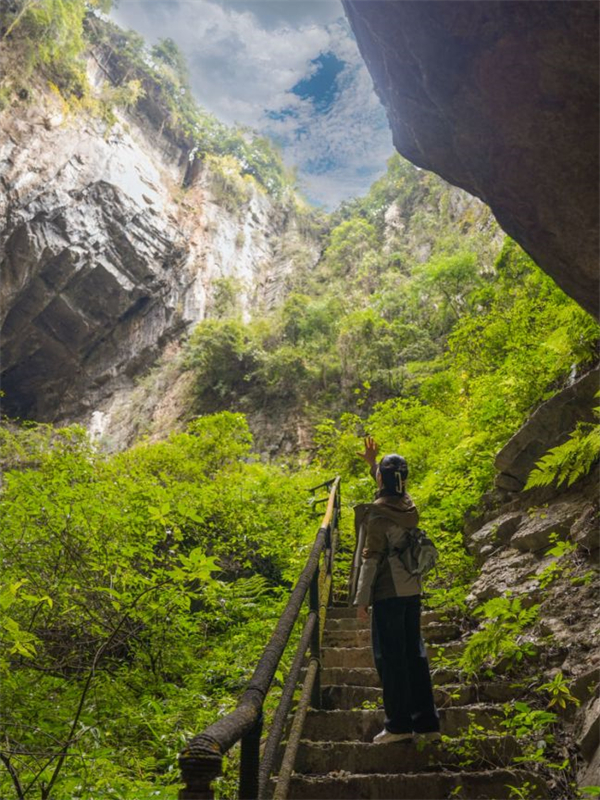 沿著崖壁“天梯”,可登上天生“四橋”頂上的涼亭,涼亭三面崖壁高懸,站在涼亭上可一覽天生橋群,橋上植被茂密、石筍林立,橋下壁立千仞、溝壑萬千、溪流岑岑,給人的震撼無法言說。