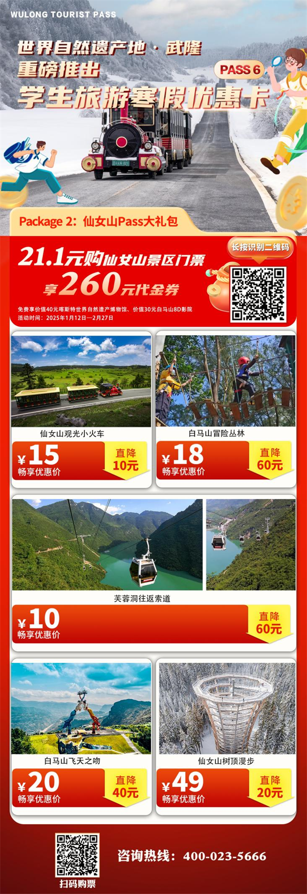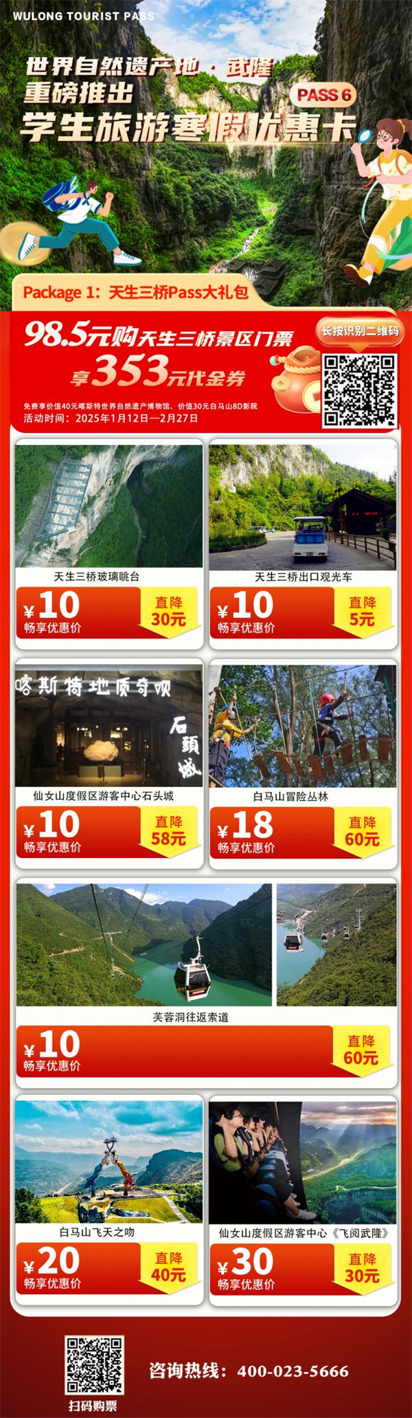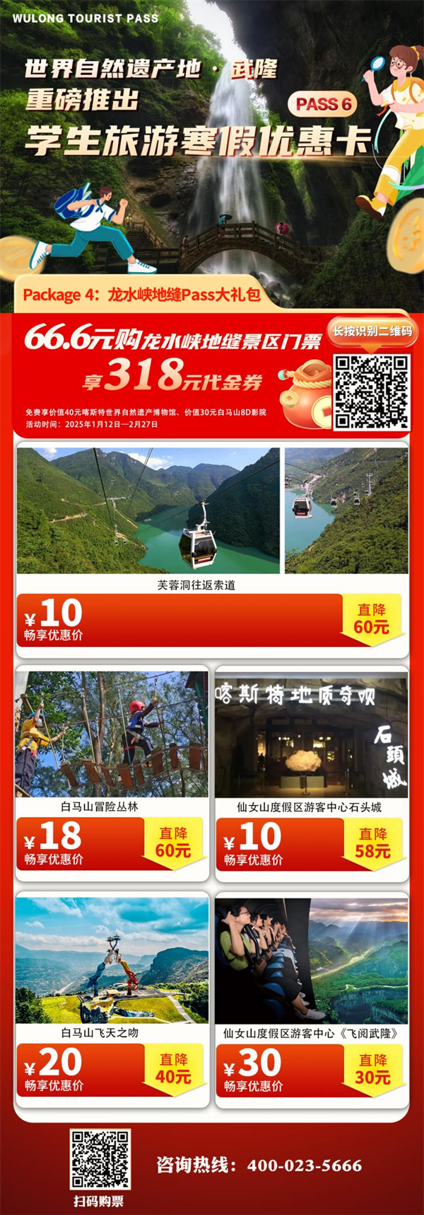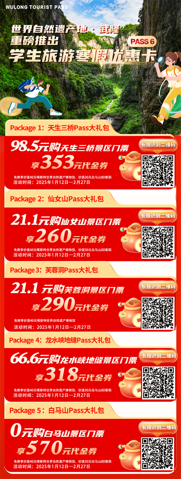 武隆景區(qū)此次更是精準(zhǔn)錨定學(xué)生群體,量身打造的學(xué)生旅游寒假優(yōu)惠卡。包含以下五種大禮包: