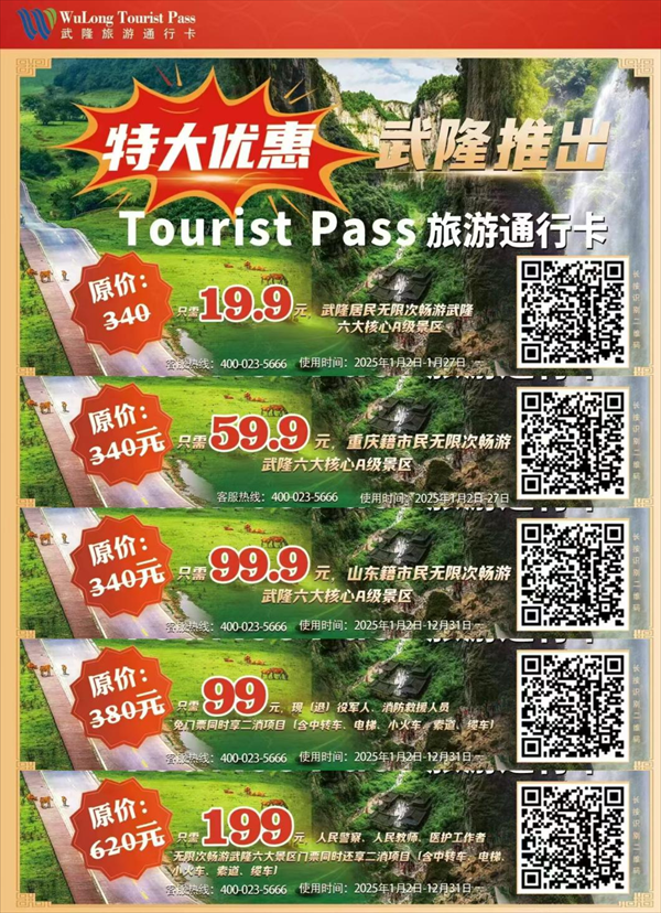 此前,武隆景區重磅推出的“WuLong Tourist Pass—武隆旅游通行卡”優惠力度巨大,近乎“免費”。針對重慶籍游客,原價340元,2025年1月2日至1月27日,只需59.9元即可購買仙女山、天生三橋、龍水峽地縫、芙蓉洞、芙蓉江、白馬山六大核心精品景區套票,無限次入園(如果第一天未能玩得盡興,第二天、第三天,乃至活動期間的任何一天,都可以接著玩)。