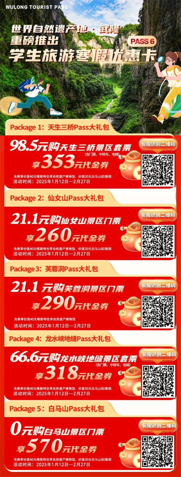 @山東籍市民、現(退)役軍人、消防救援人員、人民警察、人民教師、醫護工作者、全國在校學生,此前,武隆景區推出了不同類別的“WuLong Tourist Pass—武隆旅游通行卡”,優惠力度巨大,最低0元起購景區門票,還有海量代金券等你來領,而且春節期間也能使用,符合條件的游客千萬不要錯過呀。抓緊時間通過微信或支付寶搜索“武隆景區官方平臺”小程序,或到景區售票窗口咨詢購買吧。