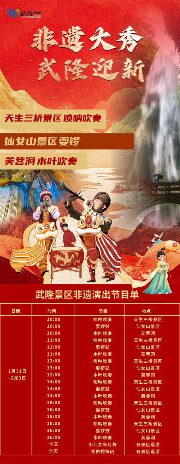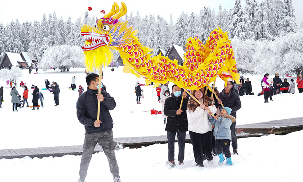 除了仙女山的絕美雪景之外,武隆景區(qū)的節(jié)日氛圍也十分濃郁,為迎接蛇年新春精心籌備了眾多活動。據(jù)介紹,1月30日至2月3日,“隆蛇共舞”“芙蓉?zé)糁i會”“非遺演出”“冰雪T臺SHOW”、“川渝特色集市”等活動將在各大景區(qū)輪番上演。屆時,這些活動定會將節(jié)日的喜慶氣氛推向高潮,為游客營造出歡樂獨特的中國年氛圍。