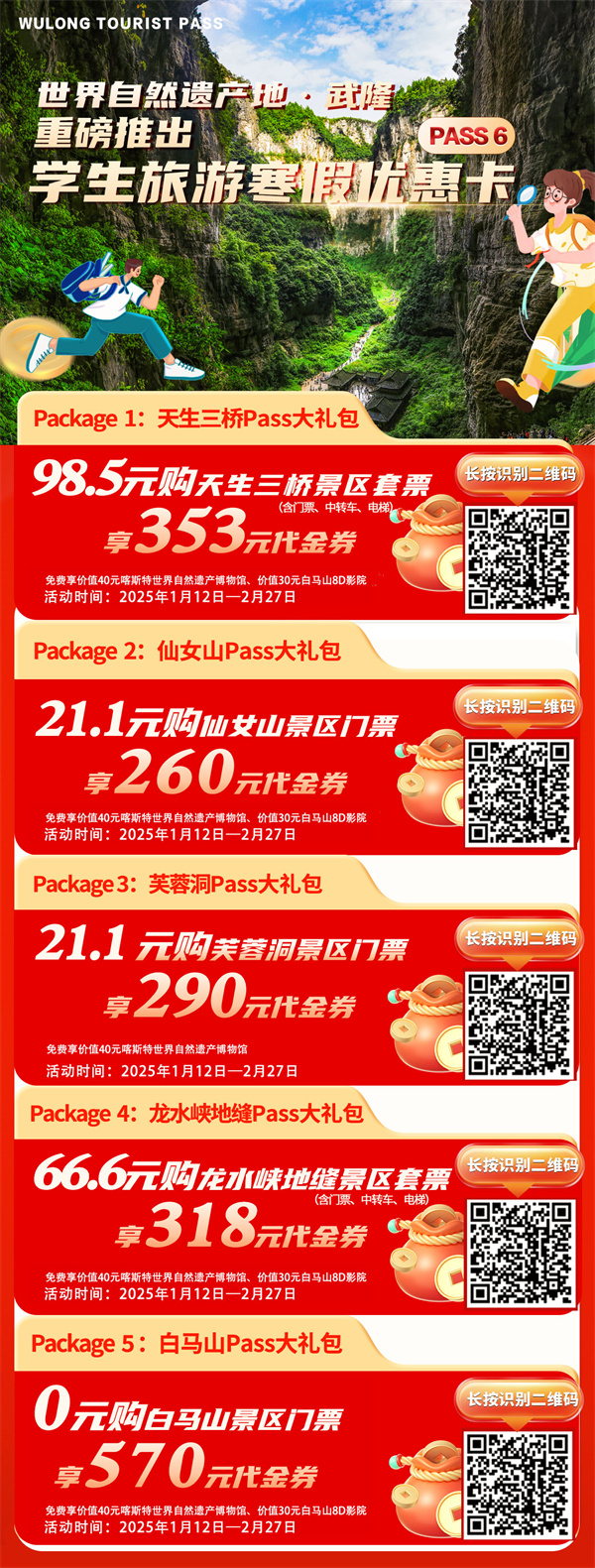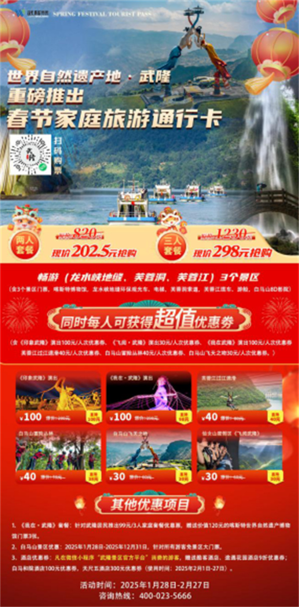 春節(jié)將至,如果您計劃前往武隆游玩,一定要記得帶上“WuLong Tourist Pass—春節(jié)家庭旅游通行卡”,有了它,您能享受到超多優(yōu)惠福利,就像薅羊毛一樣,讓您輕松薅到手軟。據(jù)介紹,2025年1月28日至2月27日,原價820元、1230元的兩人和三人套餐,只需202.5元和298元拿下,低至2.4折。套餐包含龍水峽地縫、芙蓉洞、芙蓉江3大景區(qū)(含門票、電梯、環(huán)保觀光車、索道、纜車),以及武隆喀斯特世界自然遺產(chǎn)博物館和白馬山8D影院。更令人驚喜的是,購買以上套餐后,還可分別享受680元和1020元的優(yōu)惠大禮包,涵蓋《印象武隆》《我在武隆》《飛閱武隆》、芙蓉江過江速滑、白馬山飛天之吻、冒險叢林多個熱門項目,讓您以超值的價格,盡享武隆的絕美風(fēng)光和豐富體驗。