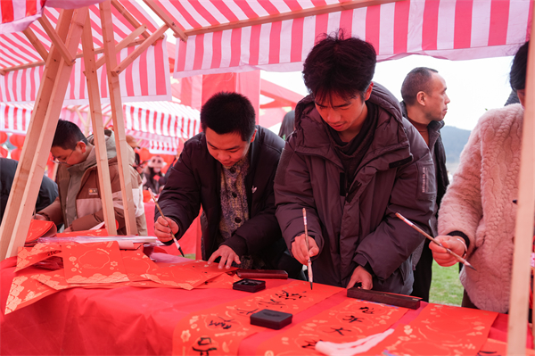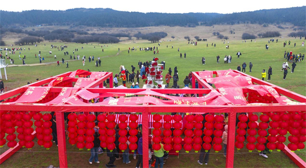 中國年·武隆味,新春集市人氣爆棚。仙女山大草原上年味滿滿的新春集市如火如荼,現場游客紛紛參與其中,與走街串巷貨郎親切交流,幸運上上簽抽一個福運簽,接財神送財,蛇形棒棒糖甜到心窩,剪窗花剪掉煩惱剩下美好,提魚燈年年有余,戴蛇年發箍好運來到,寫對聯留下美好祝愿……熱鬧的叫賣聲、孩子們的笑聲、大人們的歡呼聲,交織在一起,構成了一幅熱鬧非凡的過年圖景。