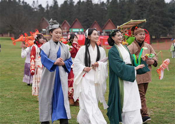 金蛇獻瑞,巳巳如意。在廣袤的仙女山大草原,一場穿越千年的浪漫邂逅帶領游客們穿越至《白蛇傳》的夢幻世界。白娘子、許仙、小青三位主角驚喜現身,穿梭在人群中,或是深情對視,或是與游客親密互動,傳遞好運、福氣,抑或是帶動游客舞動草原,現場氛圍熱烈美好。